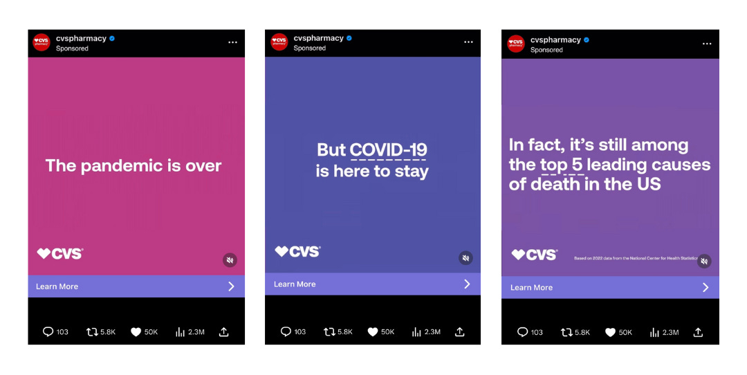I think nothing reveals this gap more clearly than an ad campaign from CVS that I came across in 2023. The first two slides read: “The pandemic is over, but Covid-19 is here to stay.” The last slide attempted to offer some clarity: “In fact, it’s still among the top 5 leading causes of death in the US.” That put Covid within the ranks of heart disease, cancer, and stroke with respect to the threat it posed to public health. And yet, the pandemic was “over.” What could this possibly have meant?