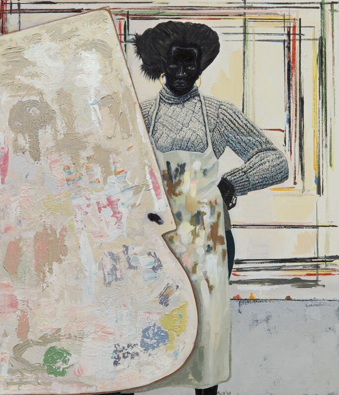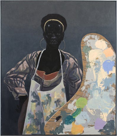 The palette is portal in the work of Kerry James Marshall, too, where Black figures hold their paint-covered palettes up to the viewer in gestures that are simultaneously offering and challenge. “Here,” these figures say; “you try.” Marshall’s exquisite 2016 retrospective at the Chicago Museum of Contemporary Art was appropriately titled Mastry, invoking both Marshall’s rightful place in a lineage of portraiture masters like Sargent as well as his challenge to the white antebellum masters who haunt Black American life to this day. Each palette he paints is evidence, source, symbol.