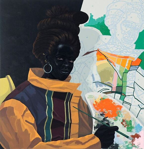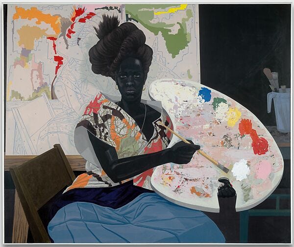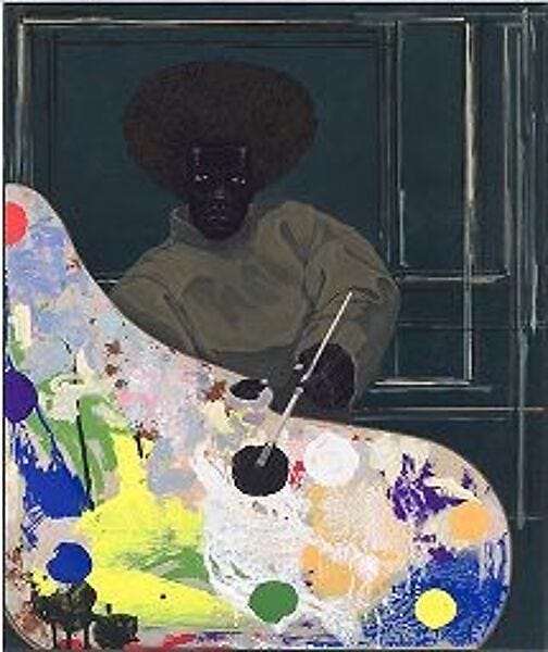 As a viewer of these paintings you are met with an uncompromising gaze, one whose hand holds the outstretched palette — always in the foreground for your scrutiny — as proof. Of what, though? Proof of competence, of mastery, of all of the skills that Black painters like Marshall surely were told were not within reach too often in their lives. The palette speaks for itself; again, all is possible.