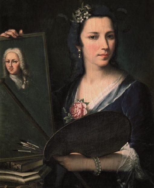 A painting within a painting is a special thing: the artist can take more liberties, can adopt a style not their own, can render someone else’s work without the stigma of mimicry. It is a way that the physicality of a canvas can enter into what is normally a portal, a surface for momentarily forgetting where one is. Think of Velasquez’s Las Meninas with its own backside, stretchers and all, painted into itself; or Siries Cerroti’s self-portrait containing a portrait and palette in hand. Zoffany’s Tribuna of the Uffizi takes this concept to the extreme, with Renaissance and Baroque paintings so numerous that they fall off of the wall and into the hands of the people inside, held at an angle and reminding us, yes, that these paintings are indeed more than just abstract images; they have a weight and size.