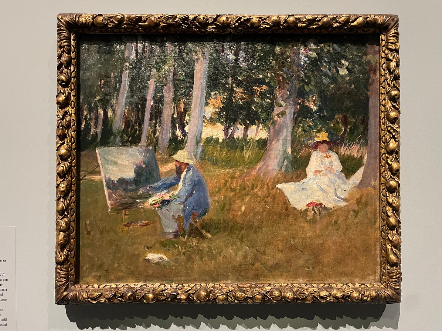 What really stood out to me, though, was a small painting near the end of the exhibition, a sort of footnote to the grand portraits that preceded it. It belonged to that genre of art within art, when paintings in the world find their way into paintings yet-to-be. In this case, Monet is seen painting en plein air with his future wife Alice Hoschedé at his side, adorned in her Victorian whites among the now-familiar forests and prairies of impressionism itself. Monet sits working on a painting — indeed the painting would become known as Meadow with Haystacks near Giverny — while Sargent’s gaze and the viewer’s merge into one, viewer becoming painter, painter becoming paint.